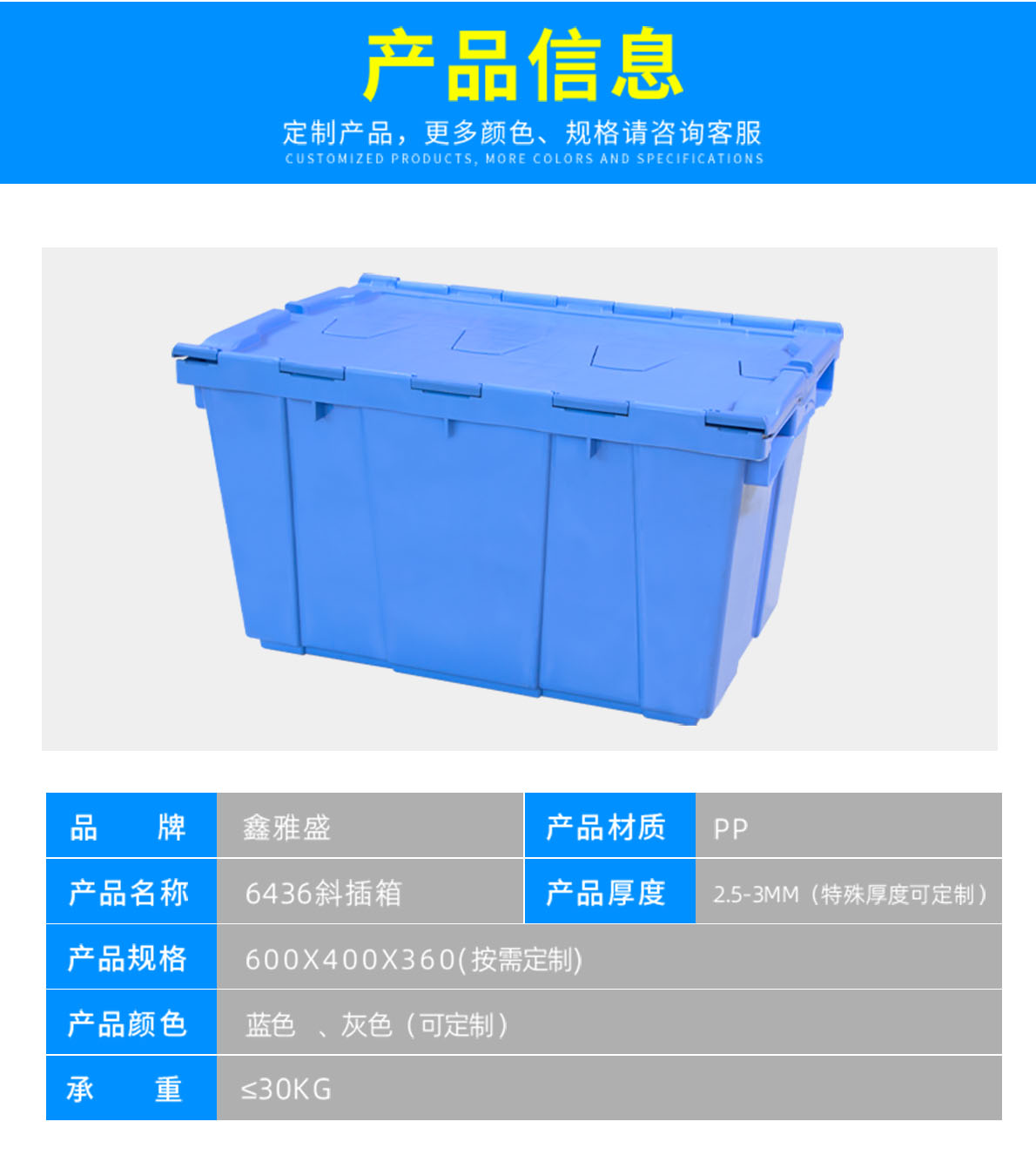 | 斜插箱6432帶蓋新模 | 550*360*295 | 600*400*315 | 60 | ≤30 | ≤150 | 3.05 | |